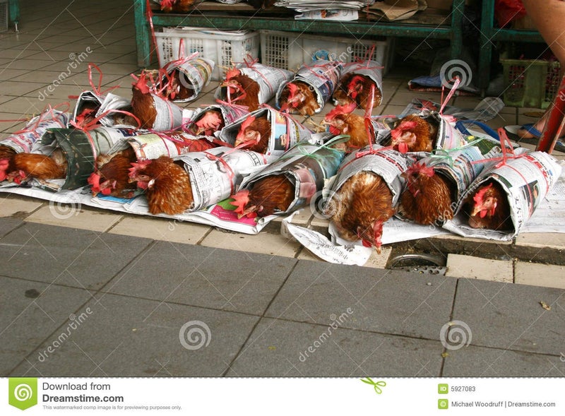 Op een markt ergens in China worden kippen zo verkocht, je zou verwachten dat ze de pootjes bij elkaar gebonden hebben, want geen kip blijft zo braaf de hele dag liggen.