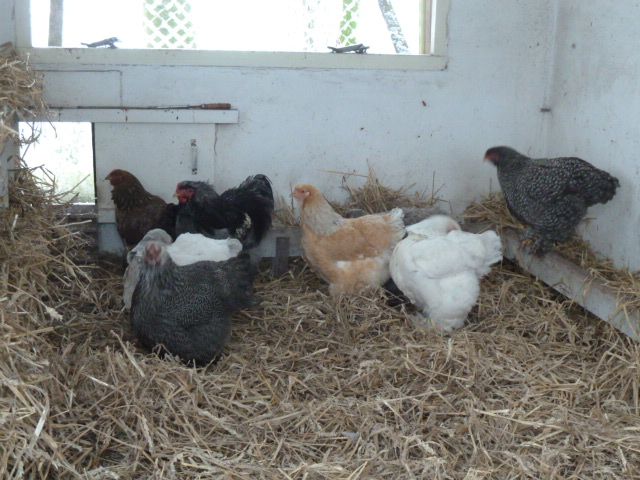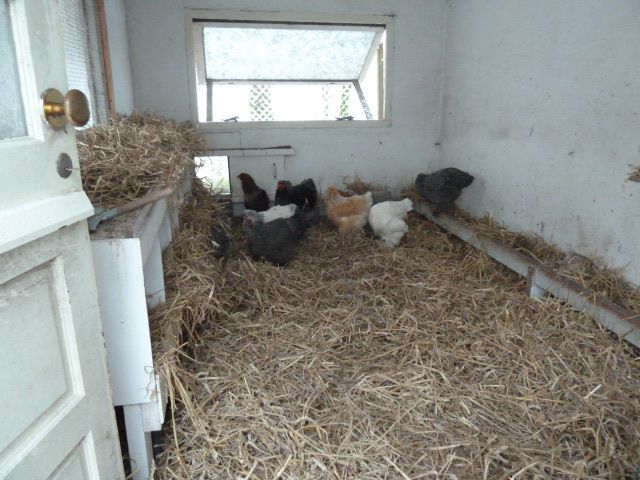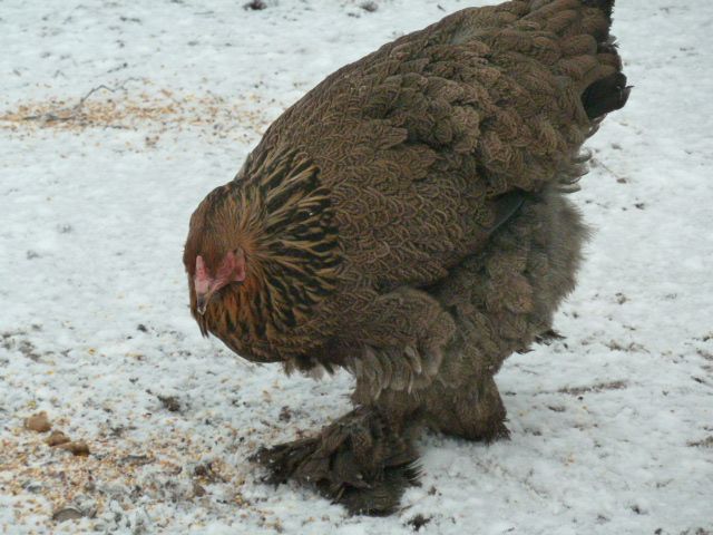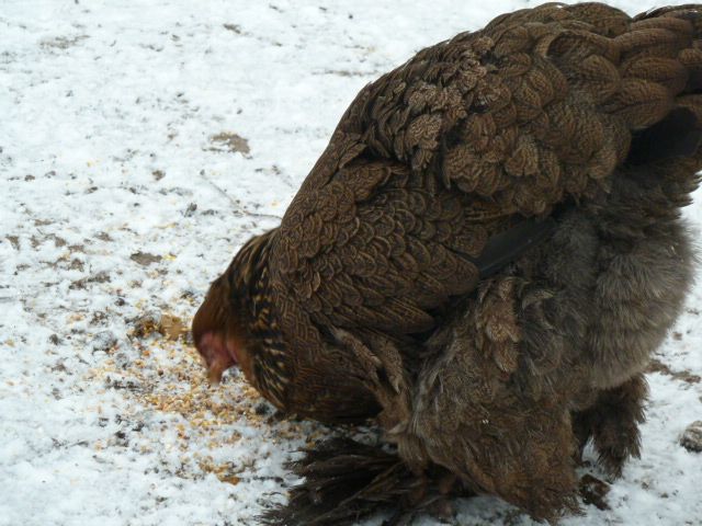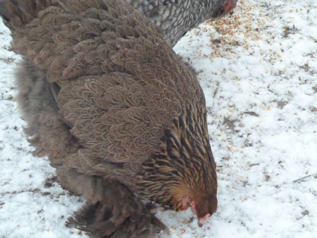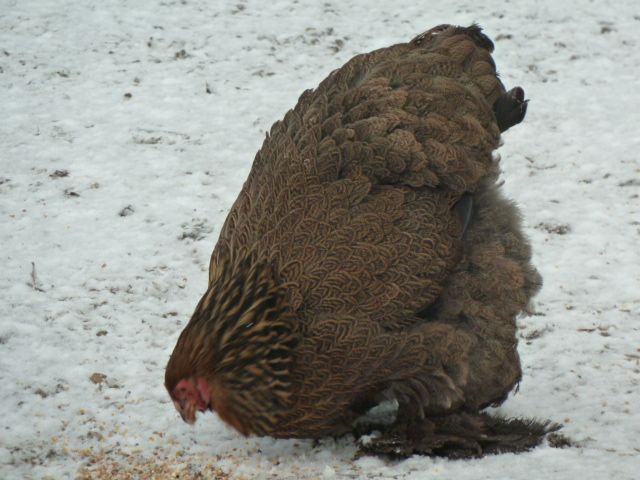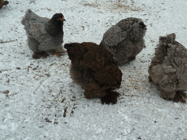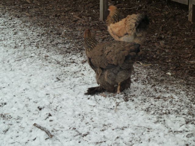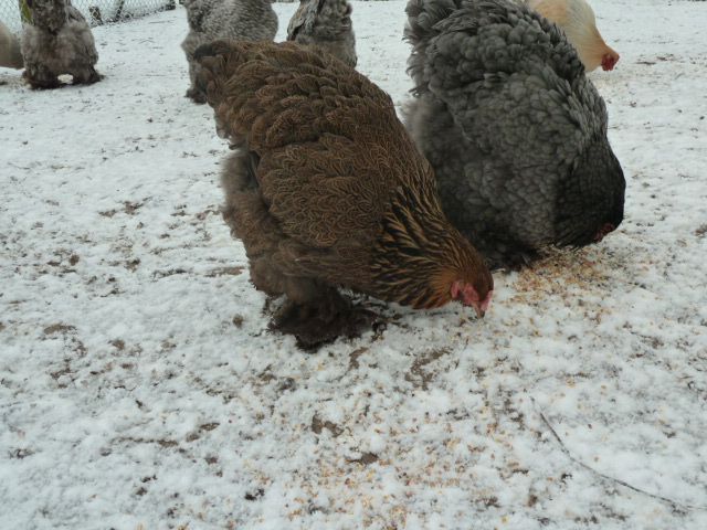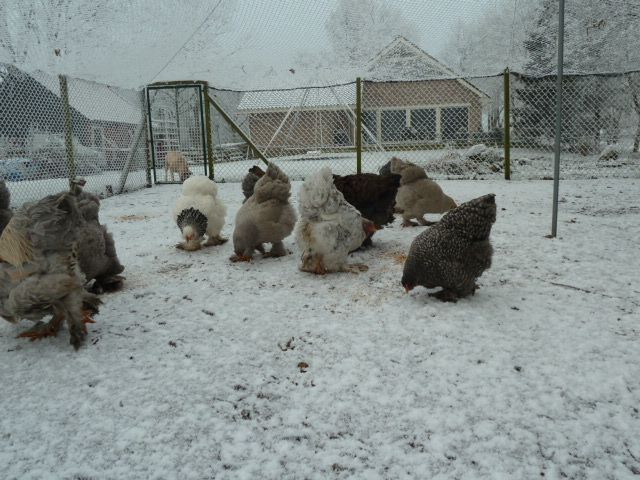 Vandaag lag er sneeuw, een deel van de kippen waagt zich toch naar buiten, sommige blijven liever binnen.