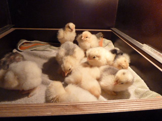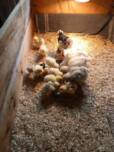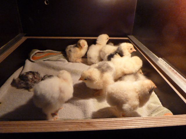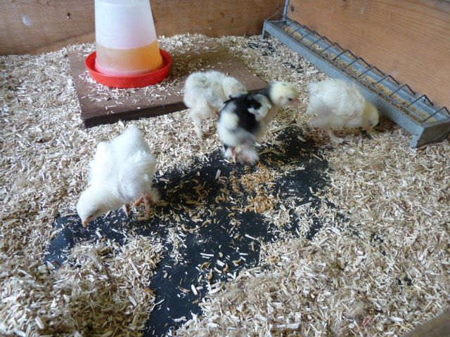 Ik heb de warmteplaat vervangen door een lamp zo kunnen ze samen met de kuikens van april in de grote kuiken bak zitten.
