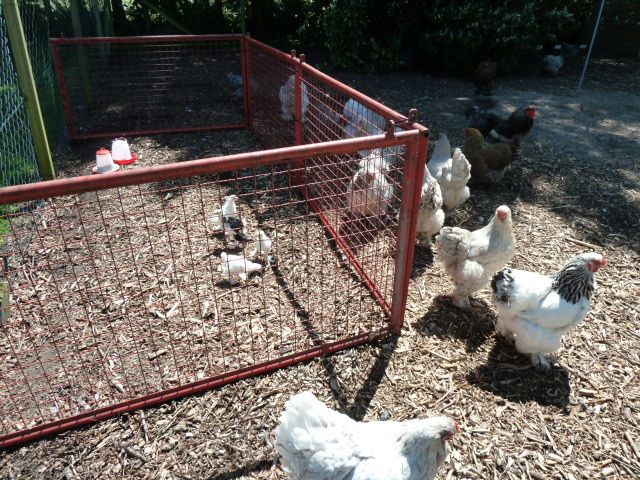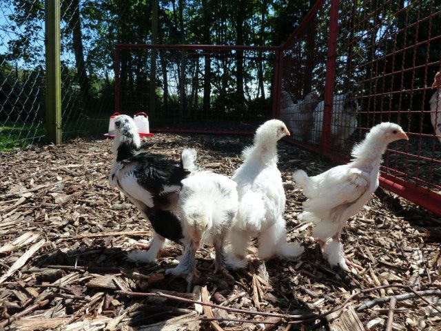 Onder grote belangstelling de 4 weken oude kuikens voor het eerst naar buiten, ze vinden het wel heel spannend, voor het eerst de zon op je lijf en modder onder je voeten, en alles ruikt anders en al die nieuwe geluiden, mmm en die grote buren poeh wel eng allemaal hoor.